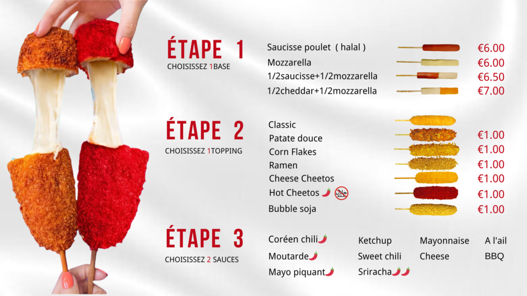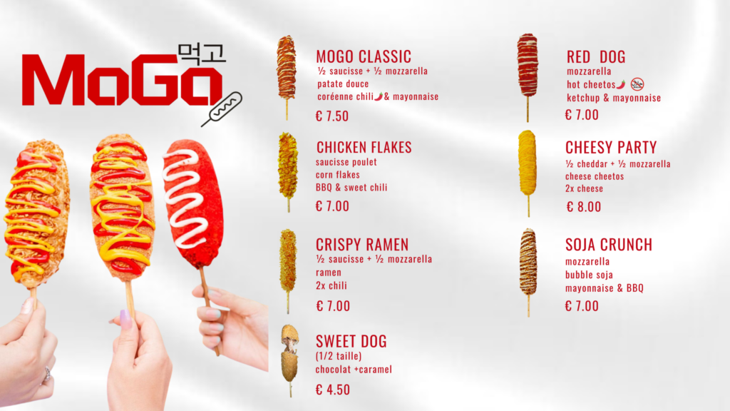 Notre menu Nous avons infusé ce projet avec notre cœur et l’esprit de Séoul, pour enchanter les rues de Liège de ses saveurs. Allergènes Si vous avez une allergie alimentaire ou une intolérance, veuillez parler à un membre de notre équipe avant de passer votre commande. En raison de la nature de notre environnement de cuisine, nous ne pouvons pas garantir que nos produits sont exempts d’allergènes. Liste des allèrgenes